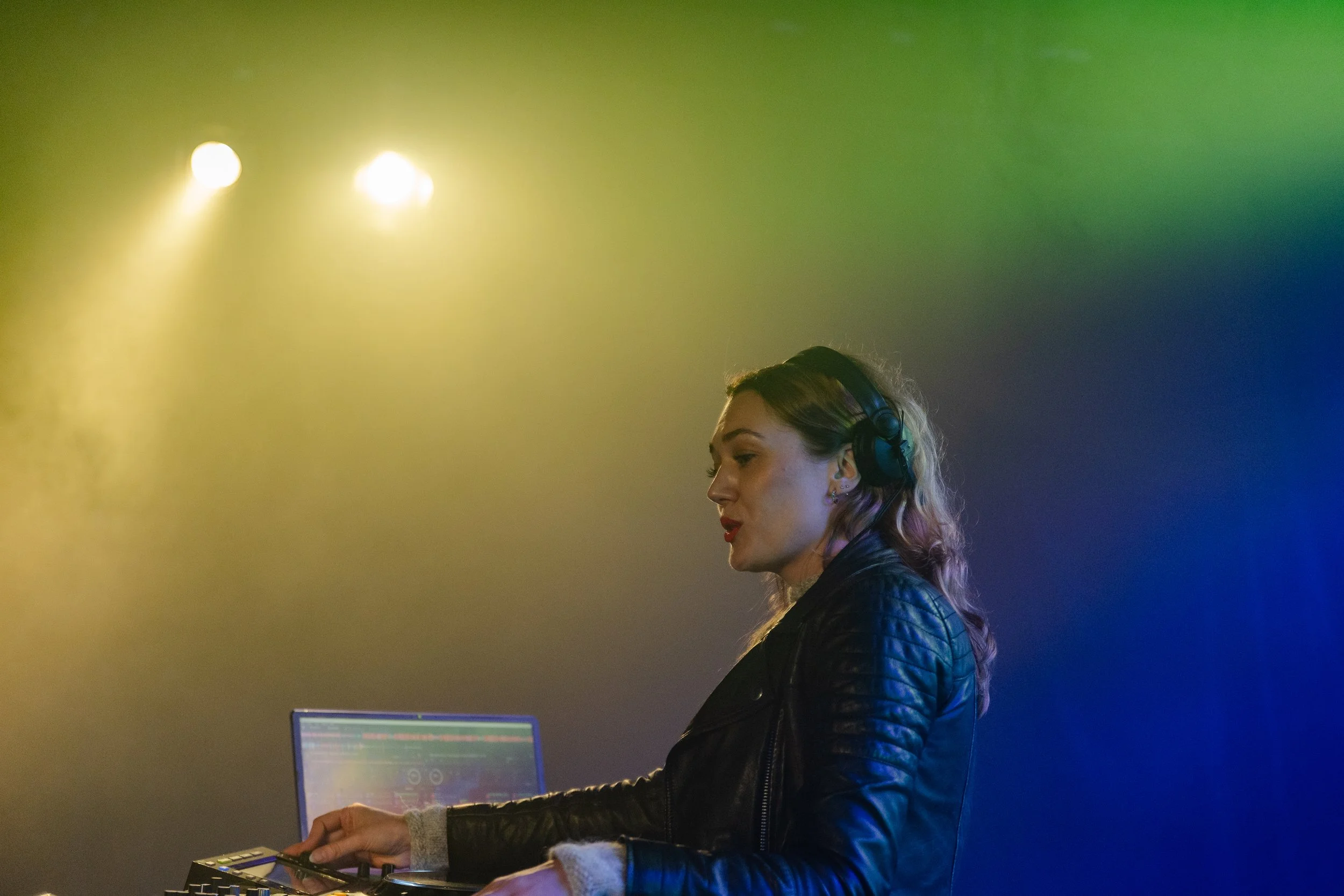 Kvinne i skinnjakke som spiller musikk som DJ med hodetelefoner og DJ-utstyr. Bakgrunnen har scenebelysning.