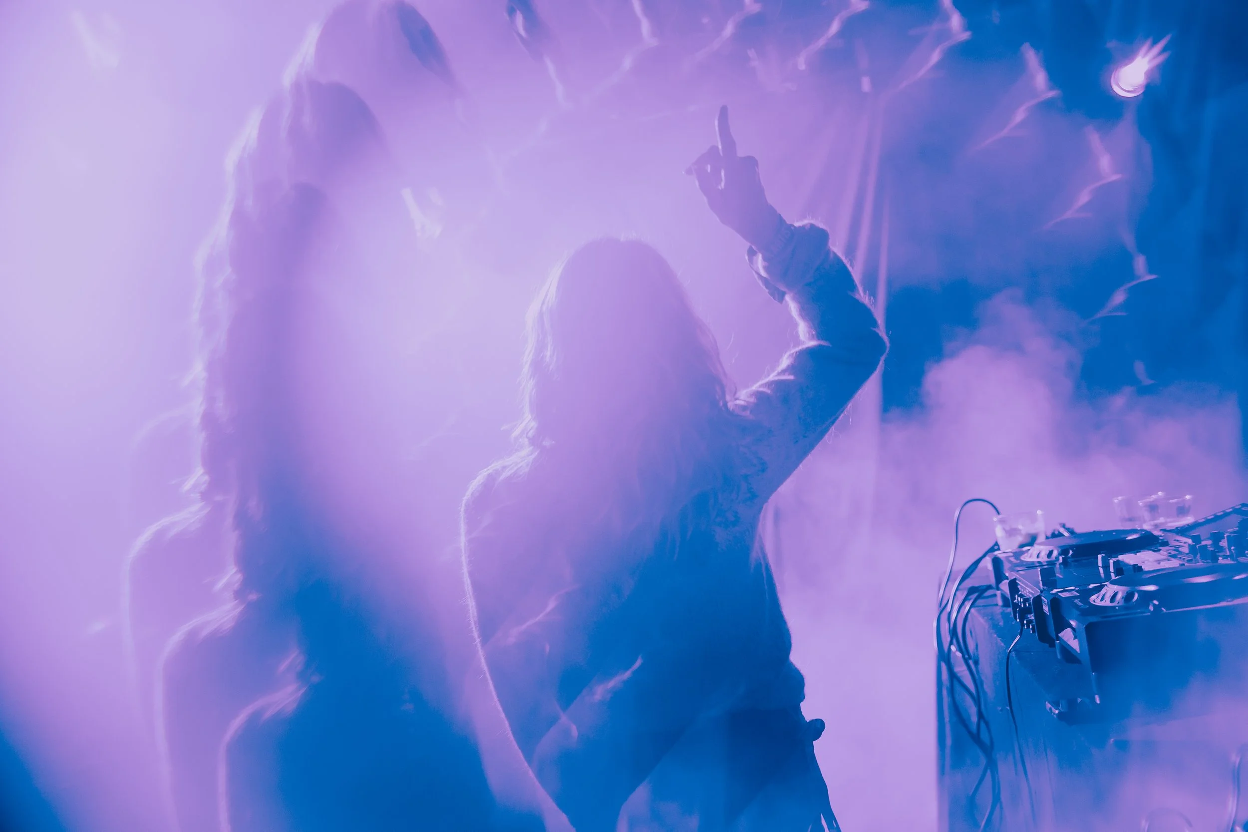 Kvinne i svart topp bruker DJ-utstyr i en nattklubb med grønn og rød belysning.